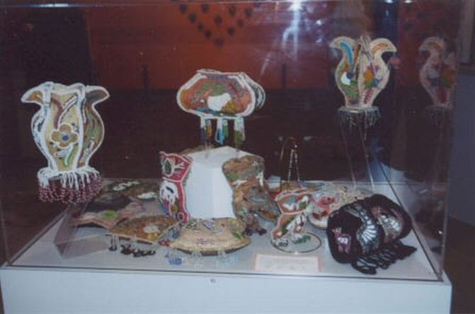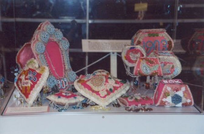 A case of early Twentieth Century Mohawk beadwork on bright pink cloth.