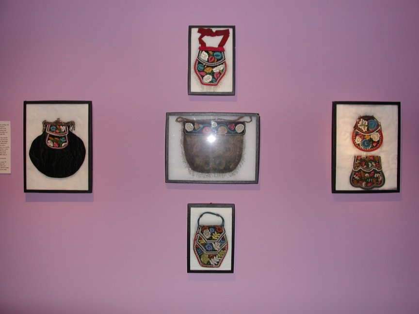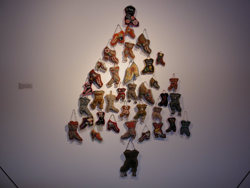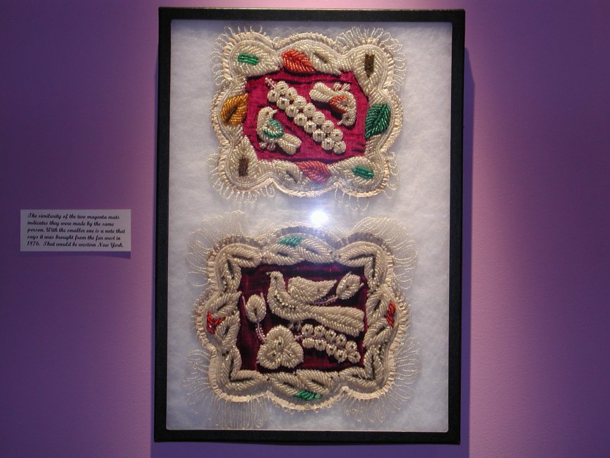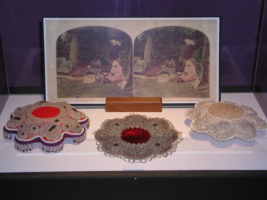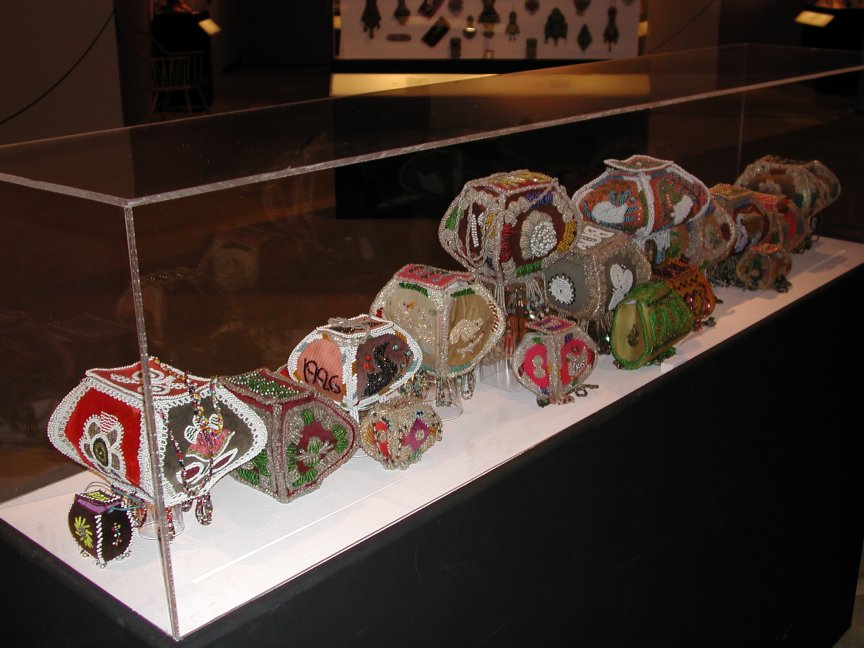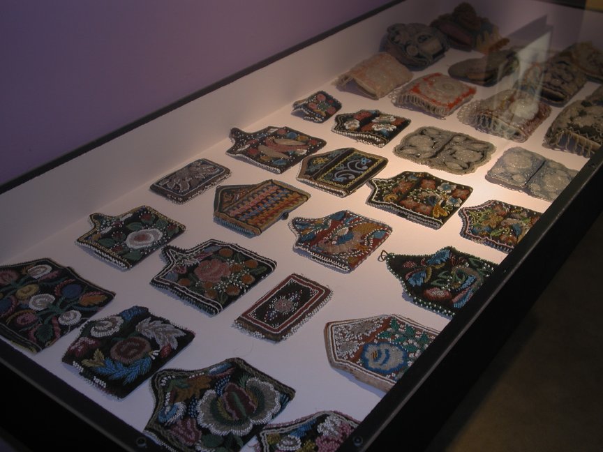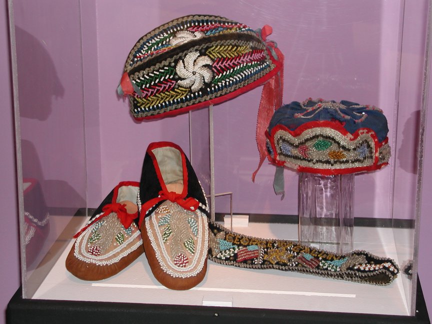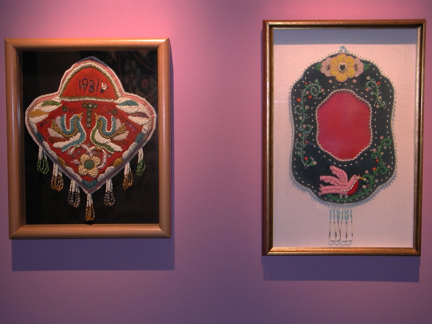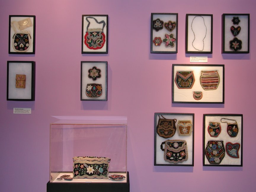 Iroquois beadworkers. Many have beaded dates, place names, and sayings